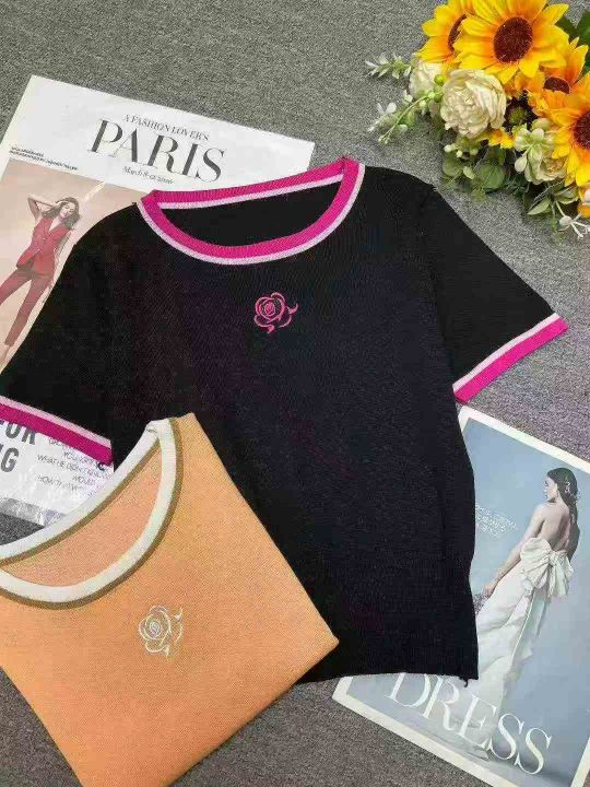 夏季新款撞色边玫瑰刺绣收腰显瘦针织短袖t桖,独立包装,均码面料柔软舒适弹力大,180件,全清6.9元超低价秒杀!