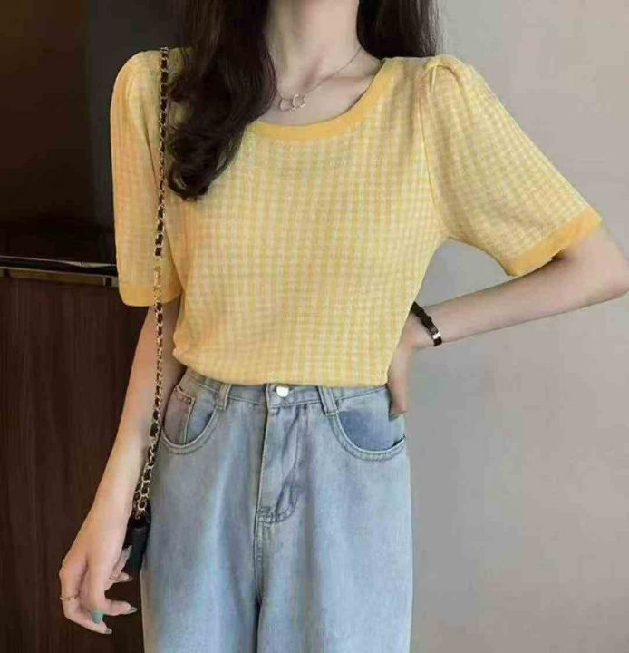 夏季新款冰丝法式独特别致质千鸟格针织短袖,独立包装...