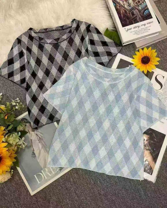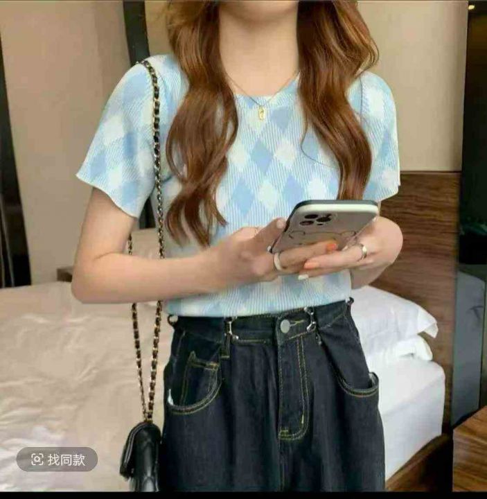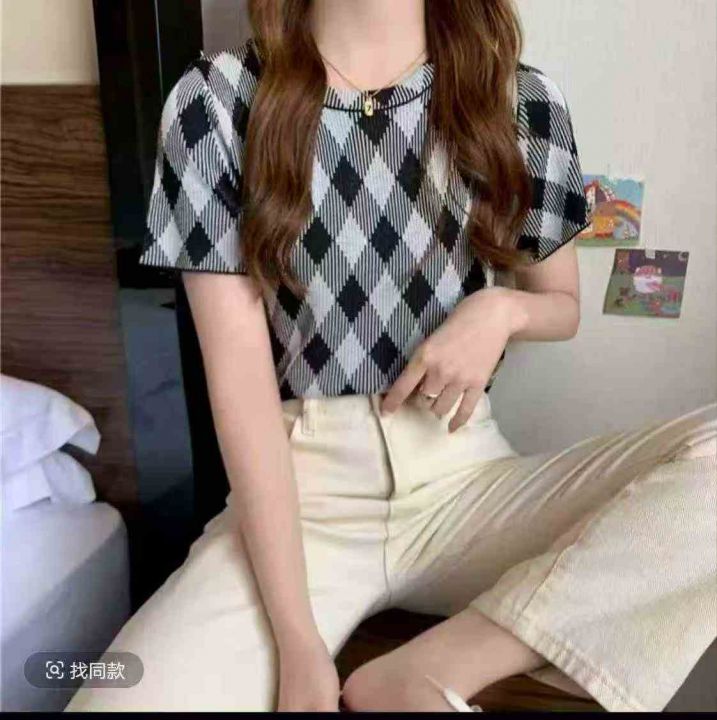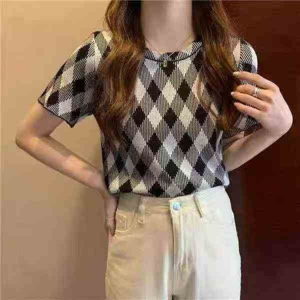夏季新款冰丝正肩洋气法式别致提花针织短袖,独立包装...