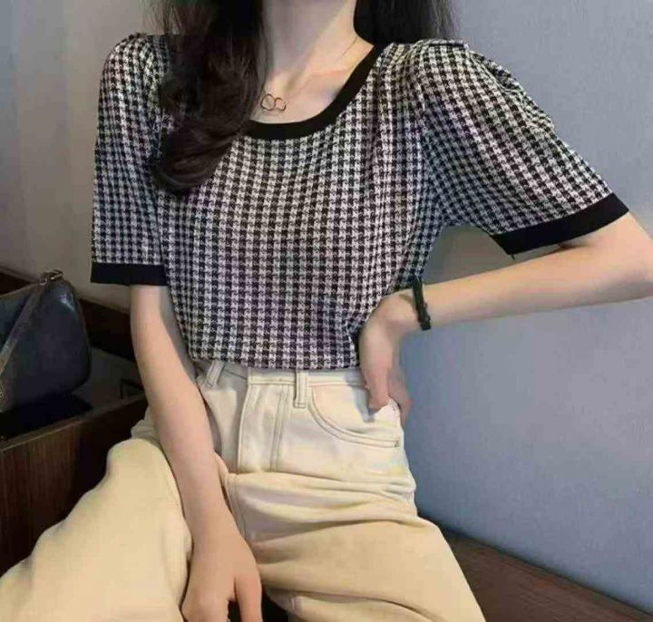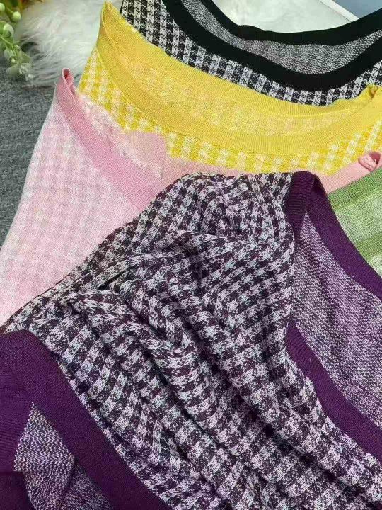 夏季新款冰丝法式独特别致质千鸟格针织短袖,独立包装...