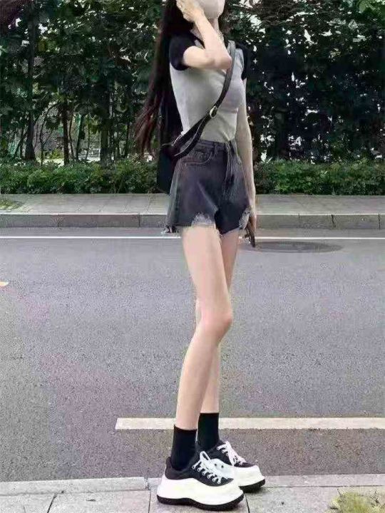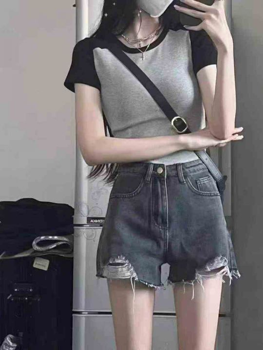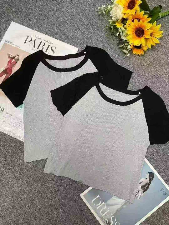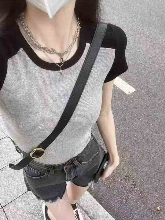 夏季新款辣妹插肩拼接撞色纯欲美式灰色针织T桖,独立...