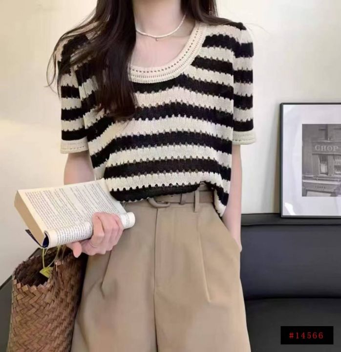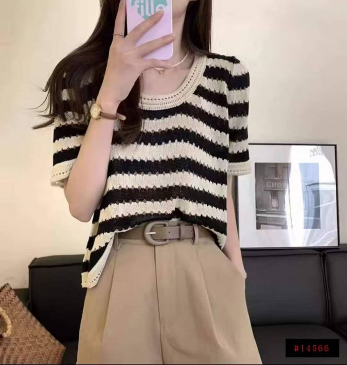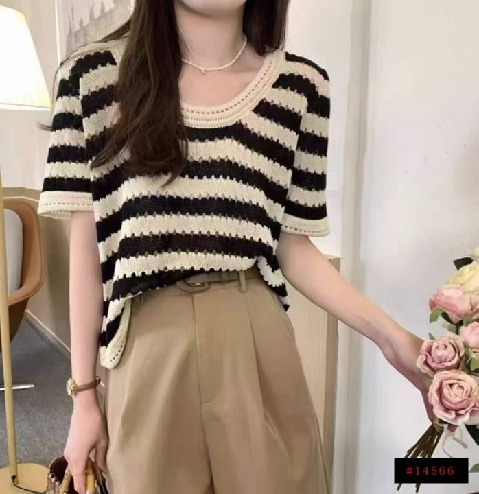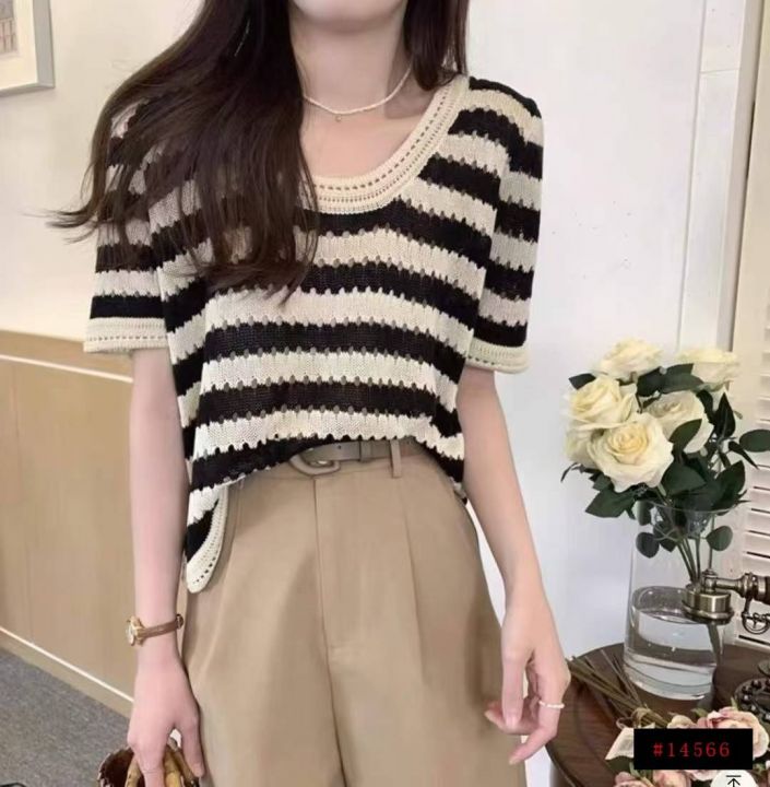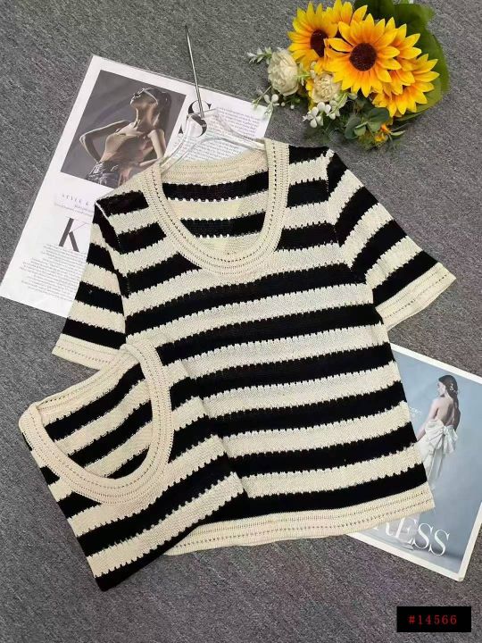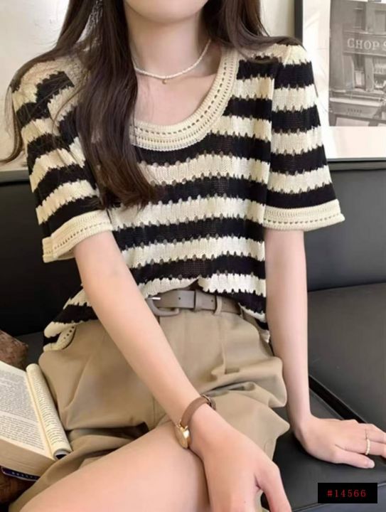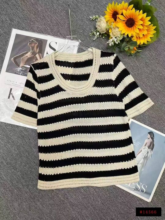 夏季新款冰丝宽松撞色条纹针织短袖,独立包装,均码宽...