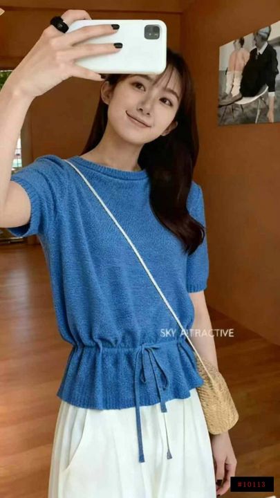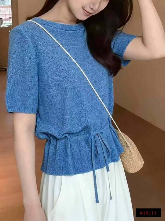 夏季新款韩系设计款收腰显瘦冰麻针织短袖,独立包装,...