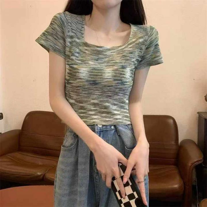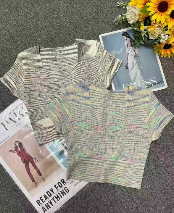 夏季新款撞色彩虹条纹网红爆款短袖针织衫,独立包装,...