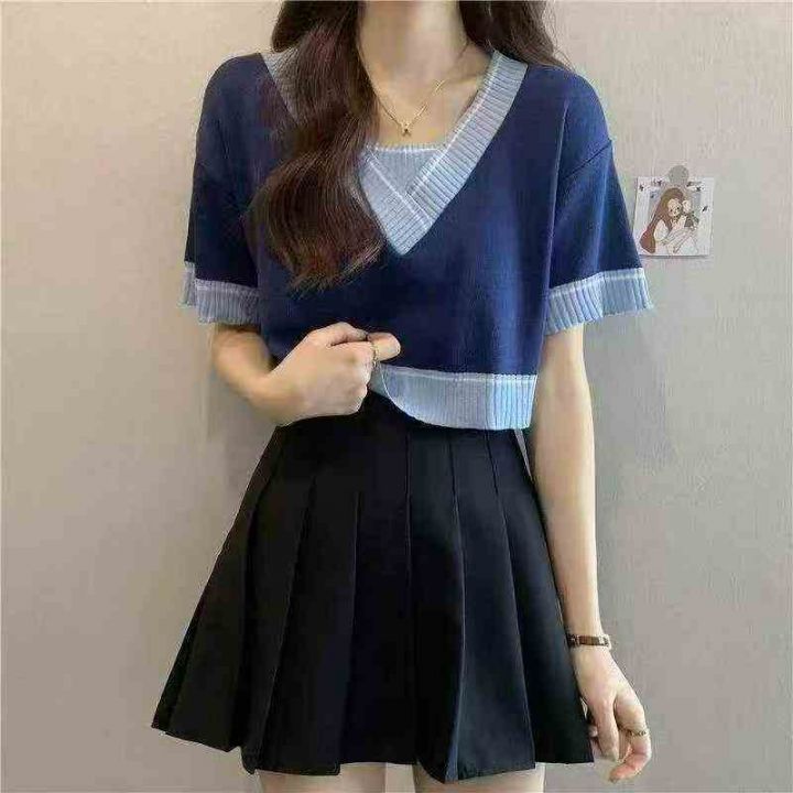 夏季新款港味风假两件V领短款宽松针织短袖T桖,独立包...