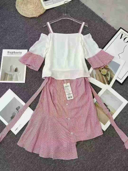 ☕️韩版小性感一字领露肩拼色吊带裙条纹短袖连衣裙337件全清10.8元分货➕1元,码数S到XXL,单款单色,独立包装[庆祝][庆祝][庆祝]
