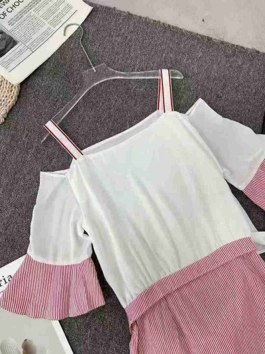 ☕️韩版小性感一字领露肩拼色吊带裙条纹短袖连衣裙33...