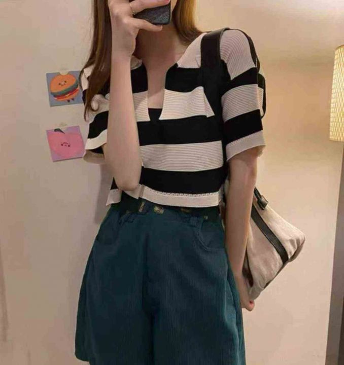 夏季新款撞色条纹宽松短款Polo领针织短袖,独立包装,...