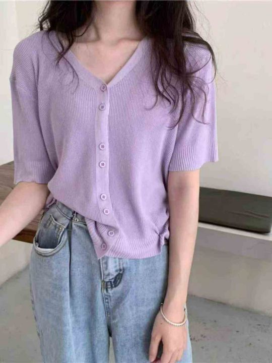 夏季新款多巴胺净版简约宽松冰丝针织短袖开衫,独立包...