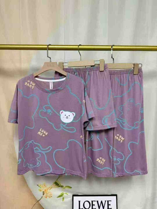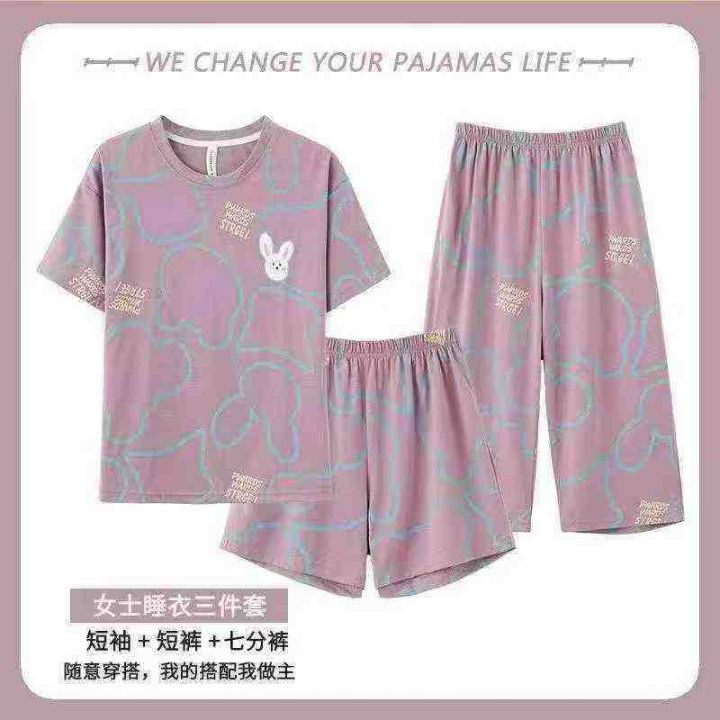 夏季女士薄款高级感三件套棉睡衣可外穿短袖短裤七分裤家居服,独立包装带吊牌,数量296套,尺码M-3XL。 货号:24862