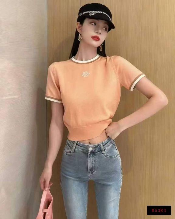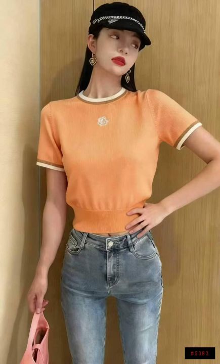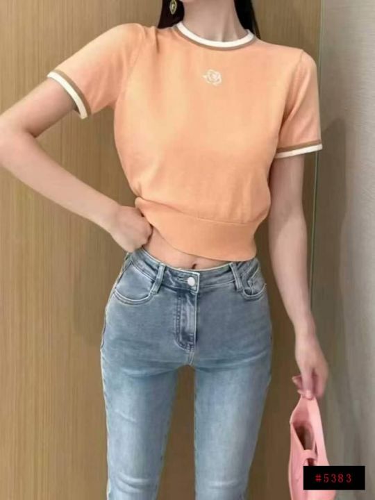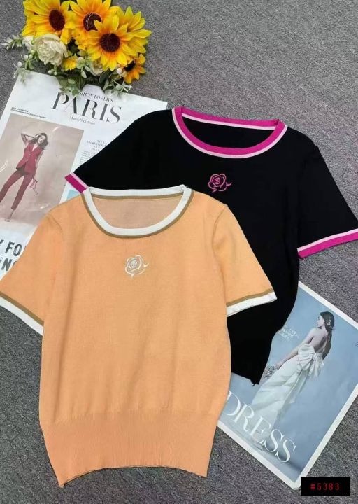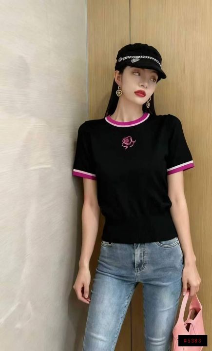 夏季新款撞色边玫瑰刺绣收腰显瘦针织短袖t桖,独立包装,均码面料柔软舒适弹力大,180件,全清6.9元超低价秒杀!@_@
