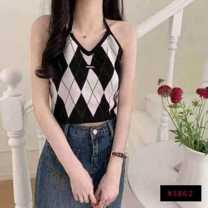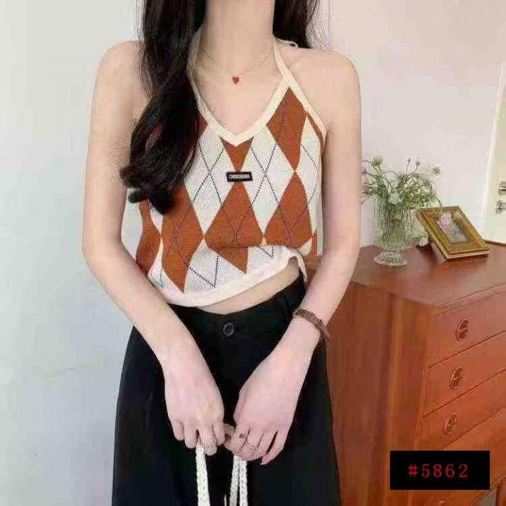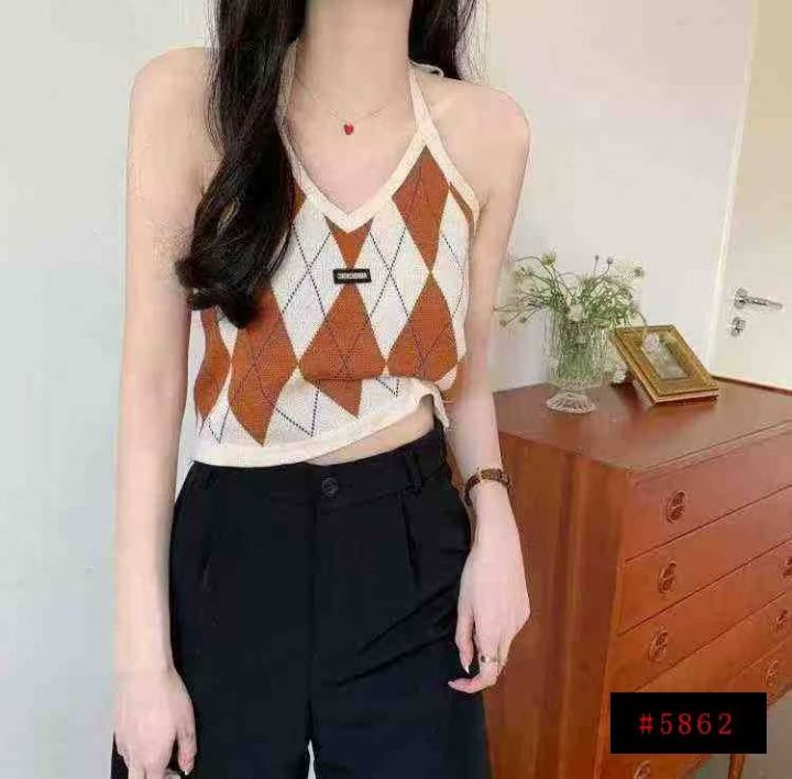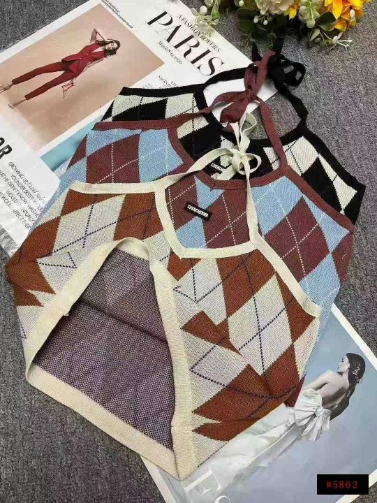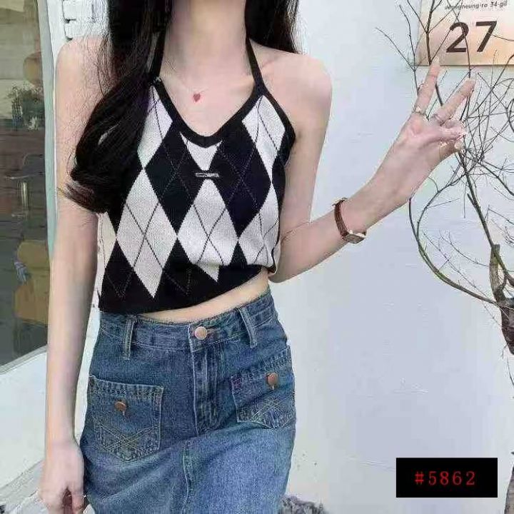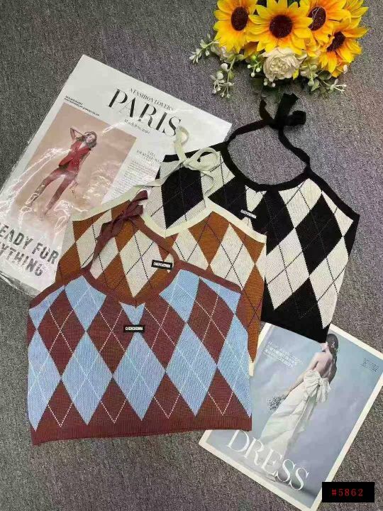 春夏新款复古菱格辣妹小标挂脖针织吊带背心独立包装,...