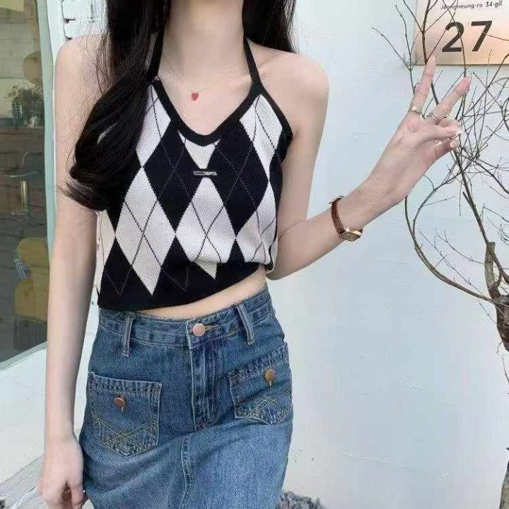 春夏新款复古菱格辣妹小标挂脖针织吊带背心独立包装,...