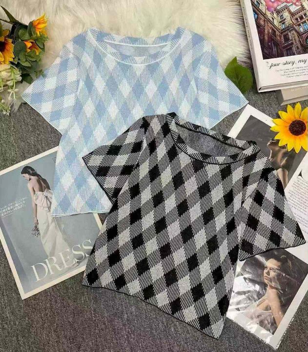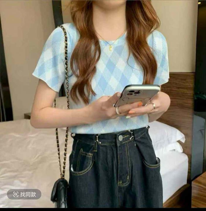夏季新款冰丝正肩洋气法式别致提花针织短袖,独立包装...