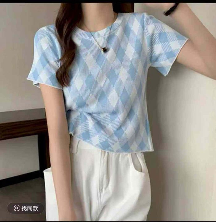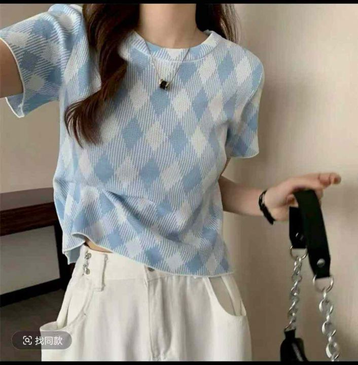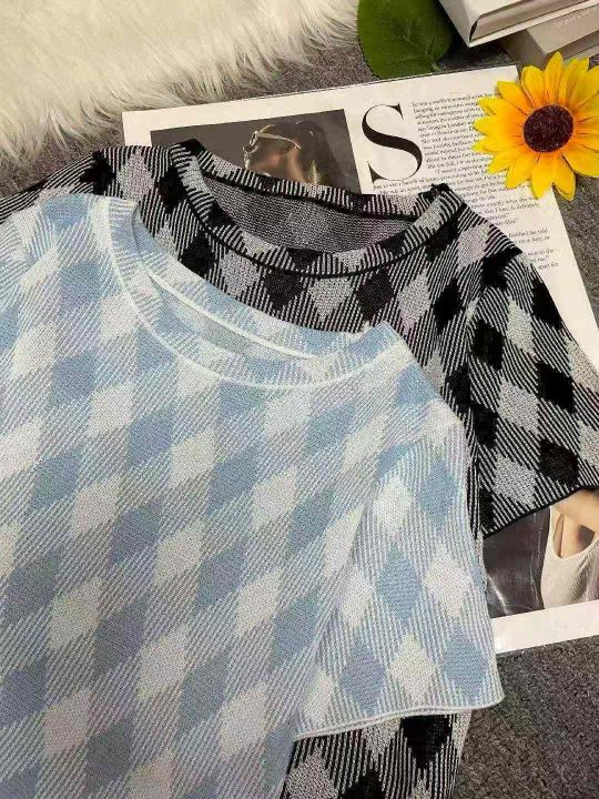 夏季新款冰丝正肩洋气法式别致提花针织短袖,独立包装...