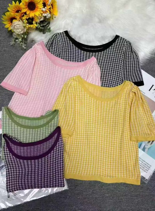 夏季新款冰丝法式独特别致质千鸟格针织短袖,独立包装...
