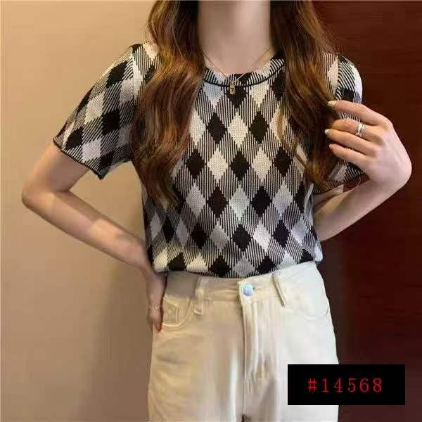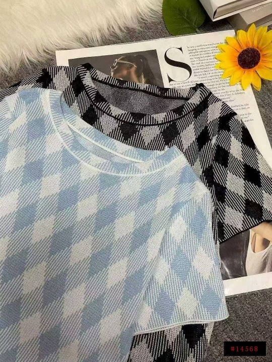 夏季新款冰丝正肩洋气法式别致提花针织短袖,独立包装...