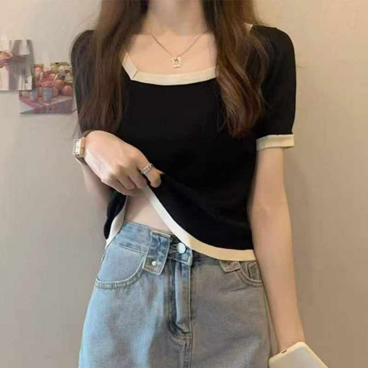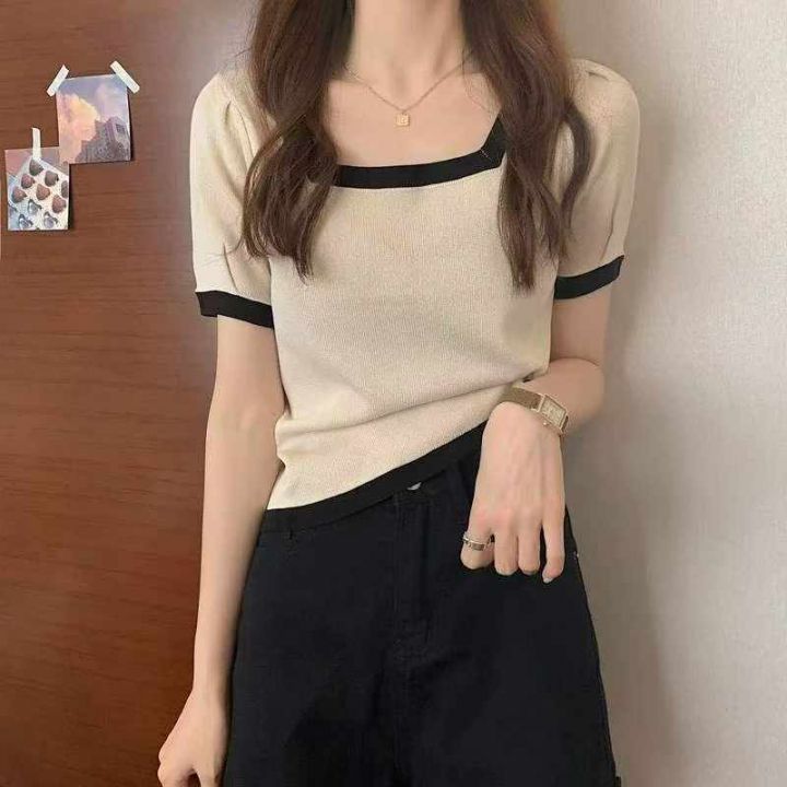 夏季新款大码宽松弹力显瘦方领冰丝针织短袖,独立包装,均码面料柔软舒适弹力,宽松版,单款4色米色黑色多,5300件,全清5.9元超低价秒杀!分货加一!