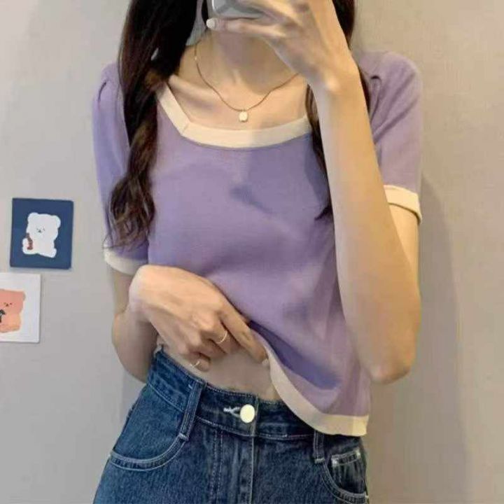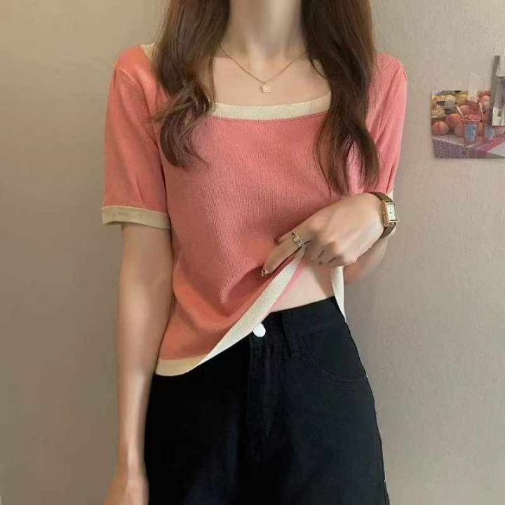 夏季新款大码宽松弹力显瘦方领冰丝针织短袖,独立包装...
