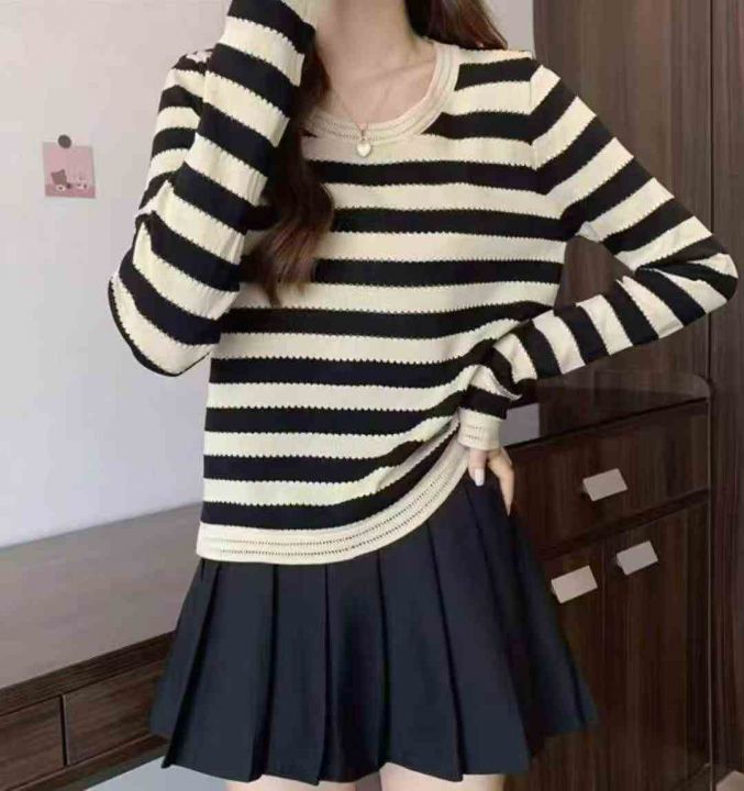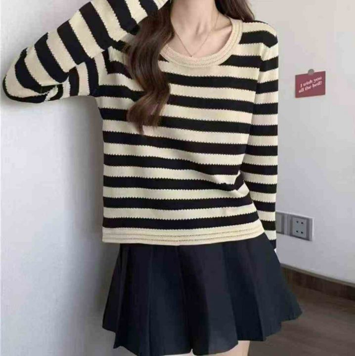 春秋款新品撞色条纹宽松正肩长袖针织衫,独立包装,均...