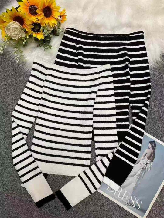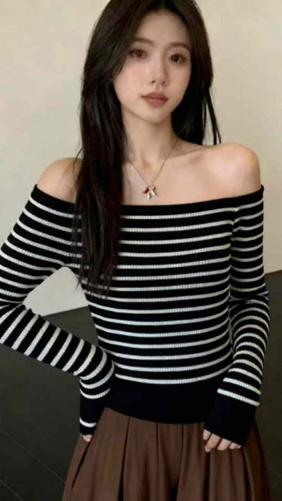 秋季新品法式条纹辣妹露肩一字肩高级感套头毛衣,独立...