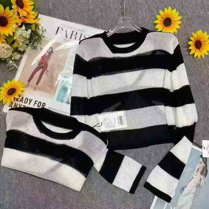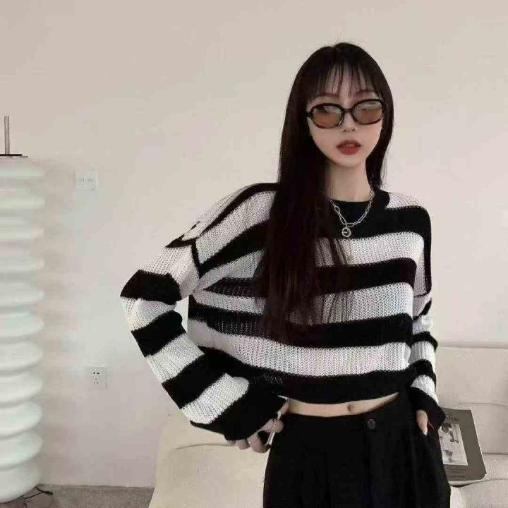 捡漏款,早秋新款靓妹短款宽松撞色黑白条纹针织长袖小...