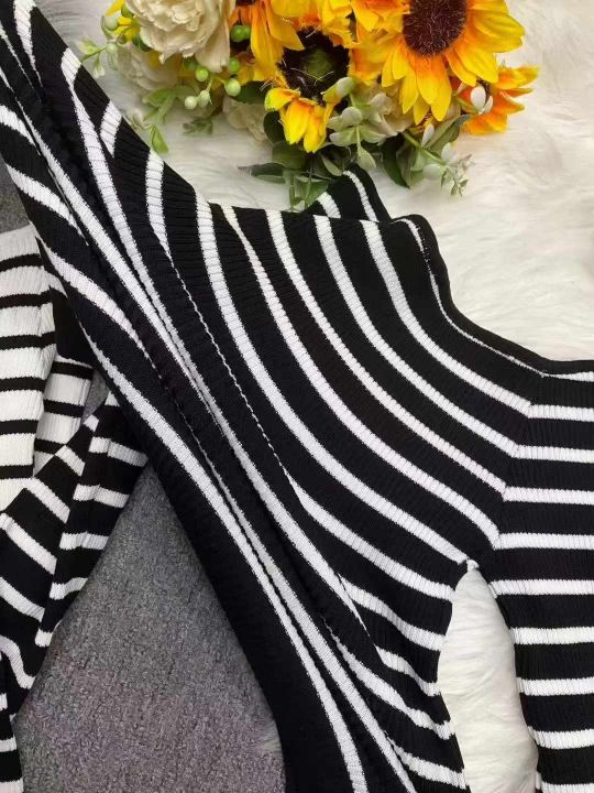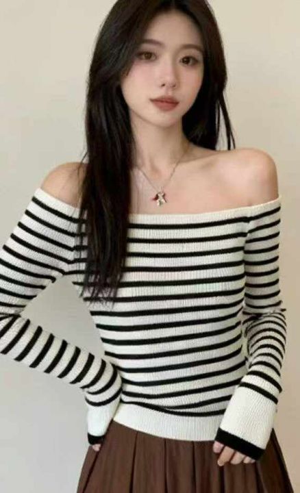 秋季新品法式条纹辣妹露肩一字肩高级感套头毛衣,独立...