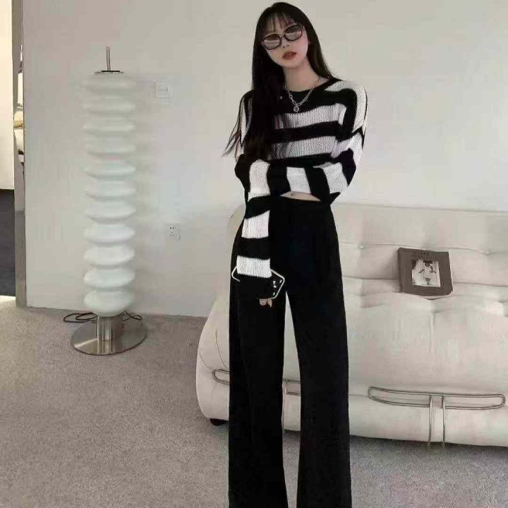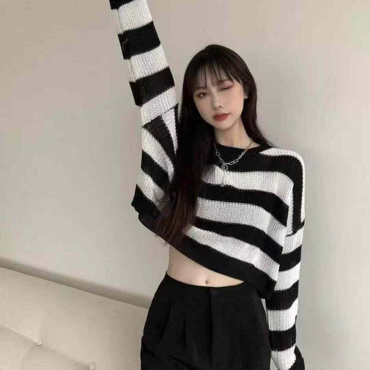 捡漏款,早秋新款靓妹短款宽松撞色黑白条纹针织长袖小...