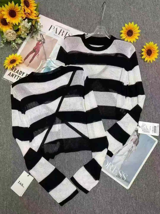 捡漏款,早秋新款靓妹短款宽松撞色黑白条纹针织长袖小衫,有垫肩,均码面料柔软舒适透气,50件,全清4.9元超低价秒杀!