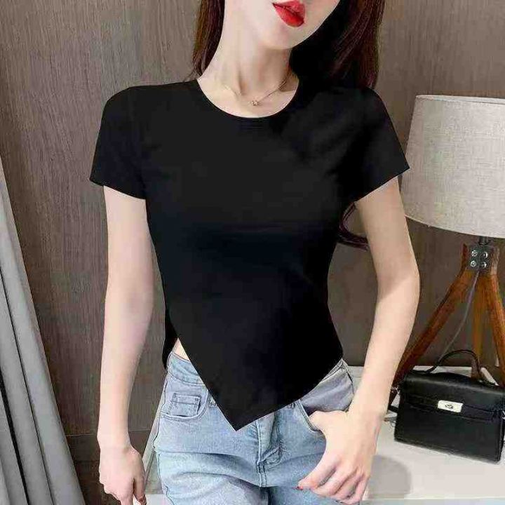 全清价6.8螺纹不规则短袖T恤夏季显瘦体恤短款甜美小上衣,独立包装,码数1-...