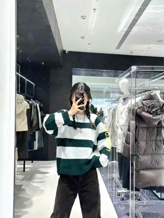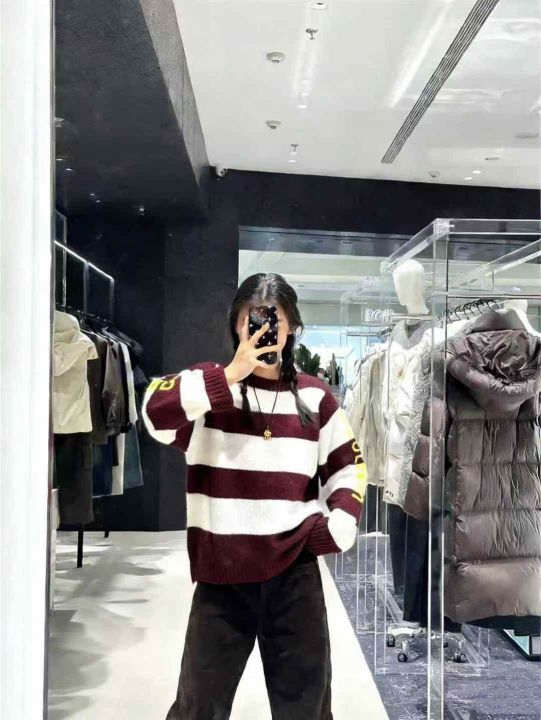 秋冬新款撞色字母条纹圆领针织衫女宽松慵懒风毛衣,独...