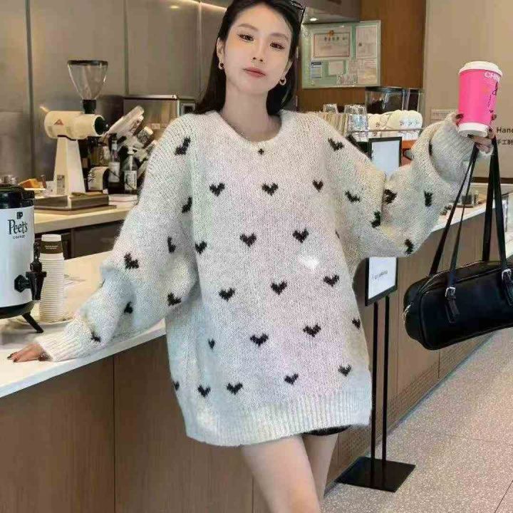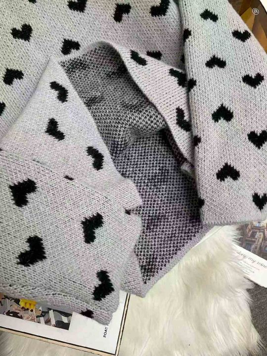 秋冬新款加厚宽松百搭慵懒风爱心提花北极绒套头毛衣,...