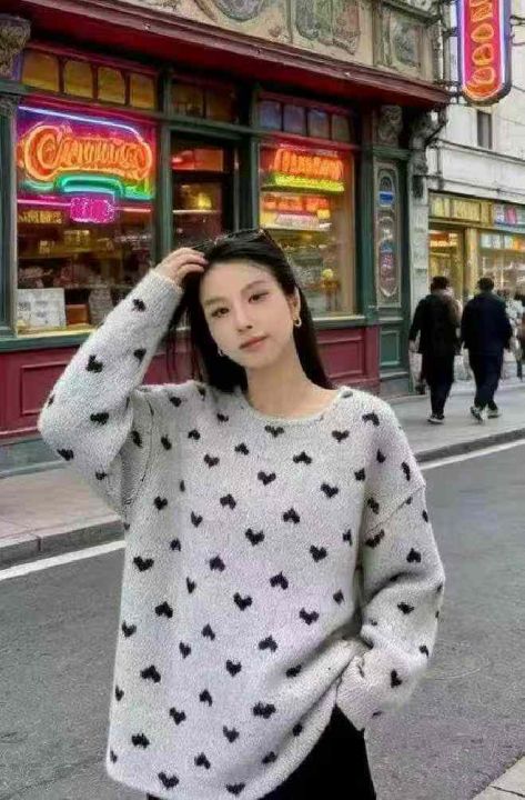 秋冬新款加厚宽松百搭慵懒风爱心提花北极绒套头毛衣,...