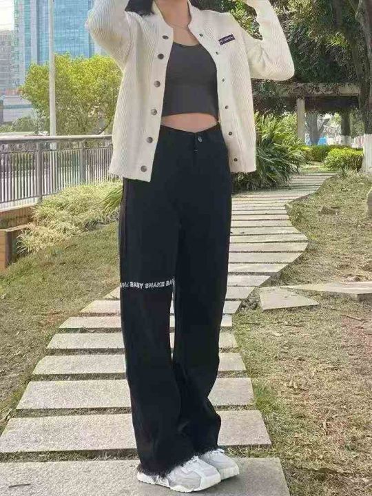 大码胖mm美式复古高腰字母印花阔腿牛仔裤女宽松显瘦拖地裤125件,独立包装...