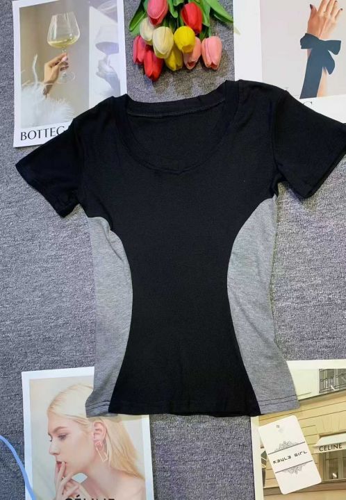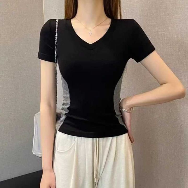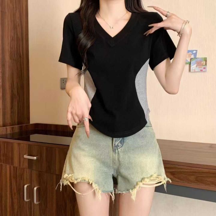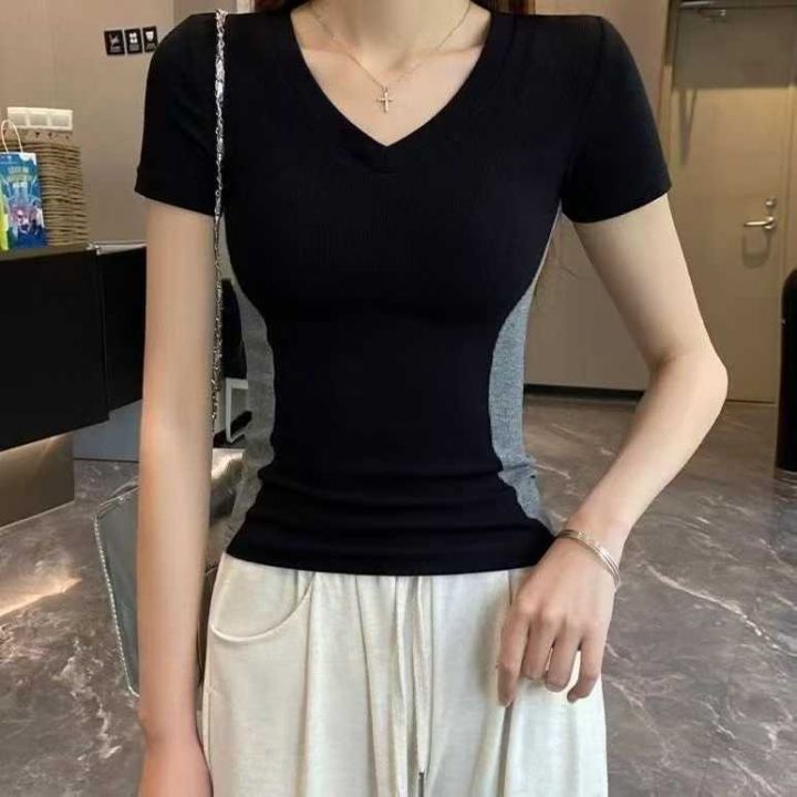甜辣V领设计感撞色拼接修身显瘦上衣,[爱心]130件左右,款号#1040,码数S-XL,穿70-120斤,万佳档口货,原包装️无瑕疵,[666]实体店品质