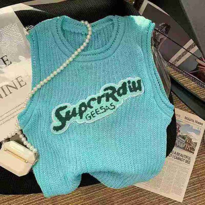 纯欲甜辣短款字母刺绣针织背心女夏季外穿宽松无袖t恤洋气小衫女,码数1-2码(sm码),数量196件