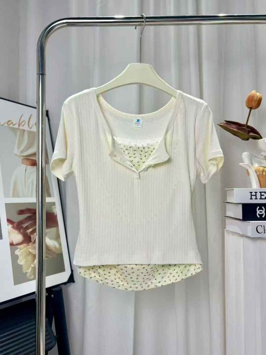 夏季新款蕾丝花边拼接假两件修身显瘦纯欲穿搭短款T恤...