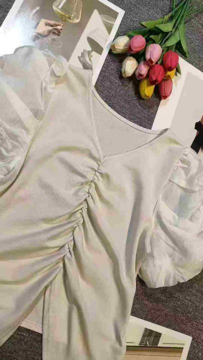 上新全清:10.8一件韩系V领设计感泡泡袖百搭上衣,[爱心]55件左右,杏色,...