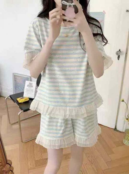 ☕️带胸垫韩国ins女士夏季条纹简约纯棉花边套装休闲宽松短袖裤睡衣家居服4...