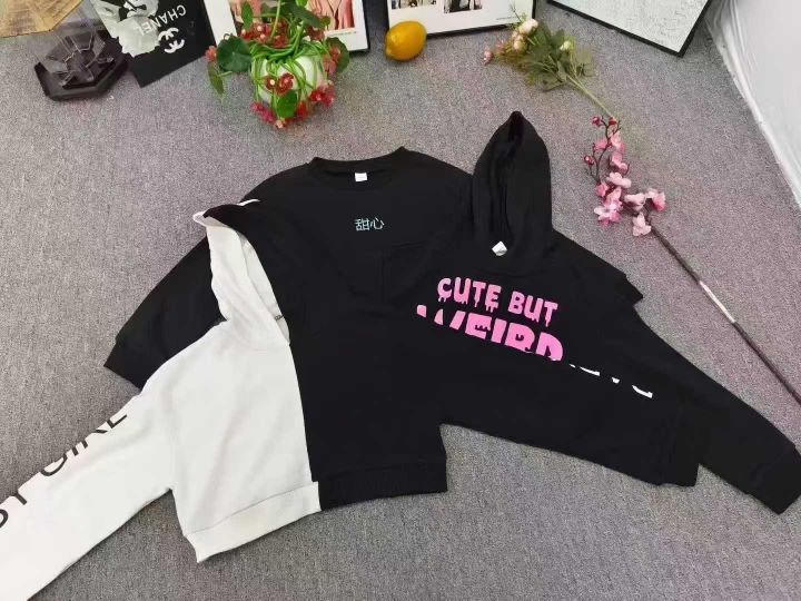 童装女童小辣妹短款卫衣,数量300件左右,尺码110--160,带帽跟圆领占比差不多,三个款,独立包装,大货干净整齐