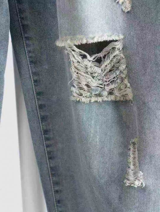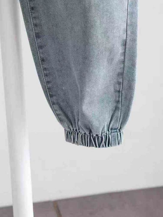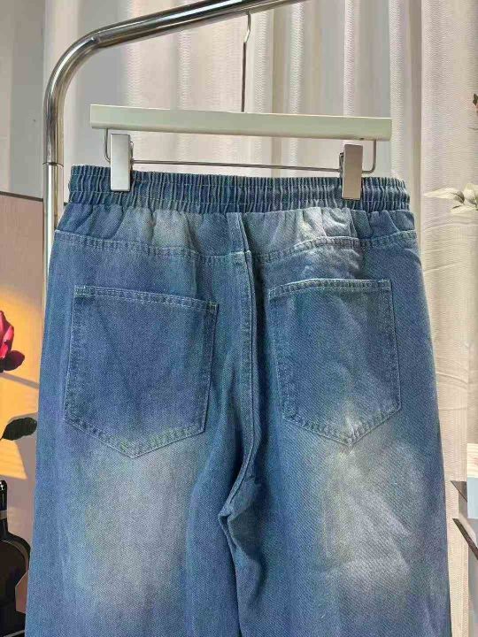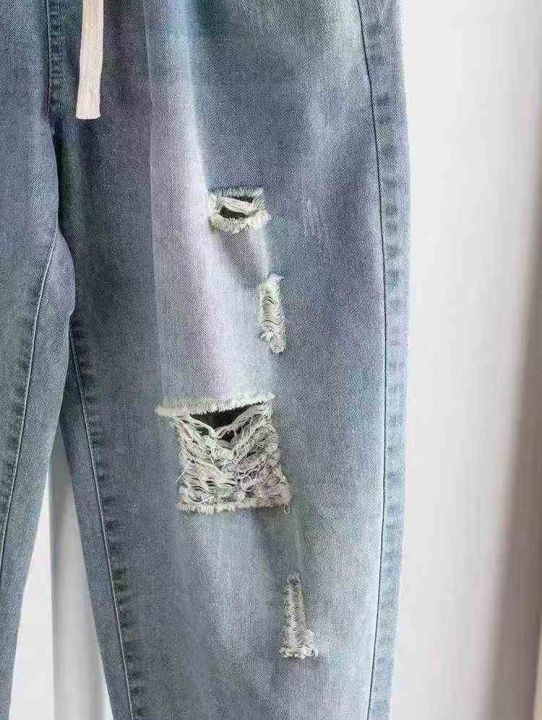 春秋季男士弹力小脚潮流破洞宽松长裤抽绳设计松紧腰牛仔裤