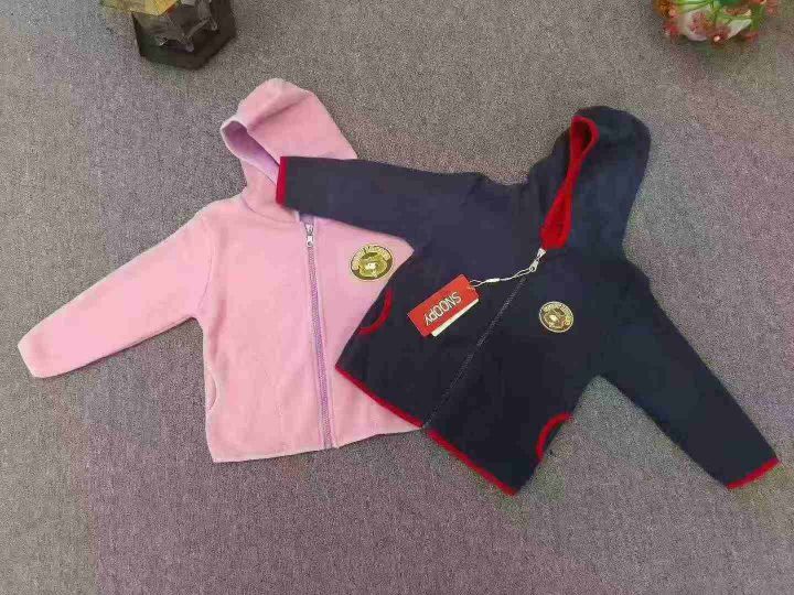 品牌童装摇粒绒带帽外套 数量2000件左右 尺码110--160 主要是史努比、棉致、baby三个品牌, 独立包装带吊牌
