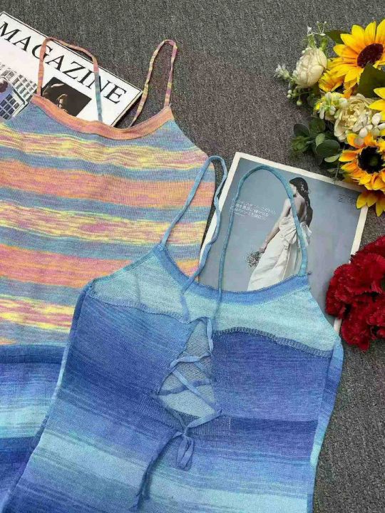 夏季新款撞色彩虹条纹辣妹性感针织吊带连衣裙,独立包...