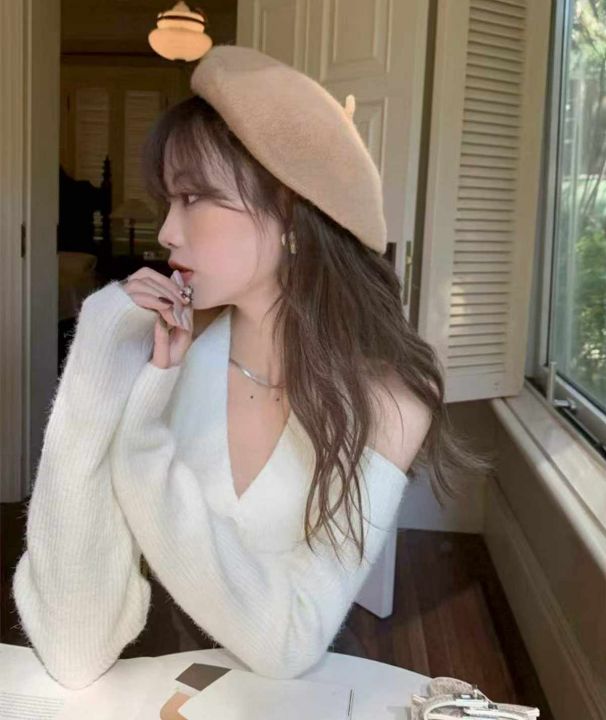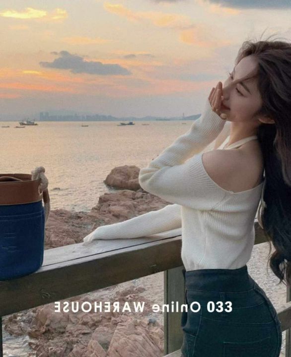 春秋新款韩系辣妹一字领露肩弹力修身显瘦挂脖针织毛衣...