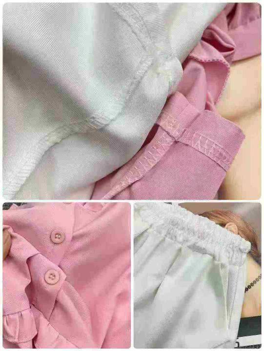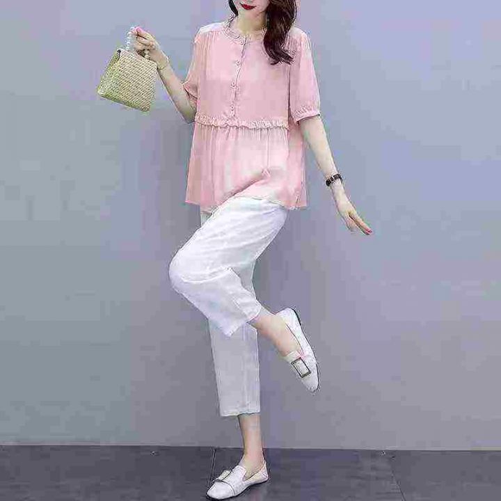 时尚减龄套装338套3.9,荷叶边拼接,纽扣设计,裤子松...