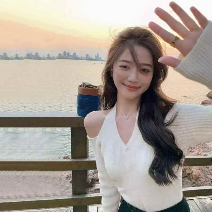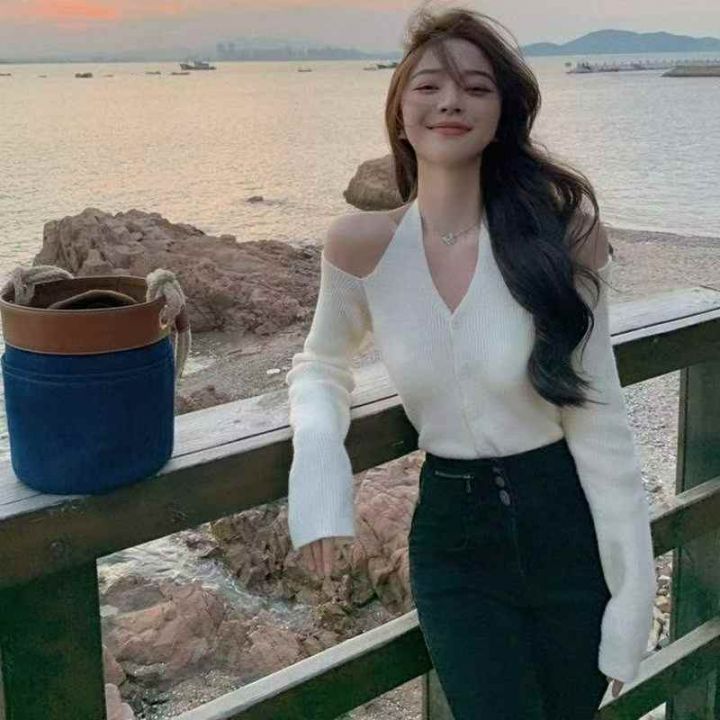春秋新款韩系辣妹一字领露肩弹力修身显瘦挂脖针织毛衣...
