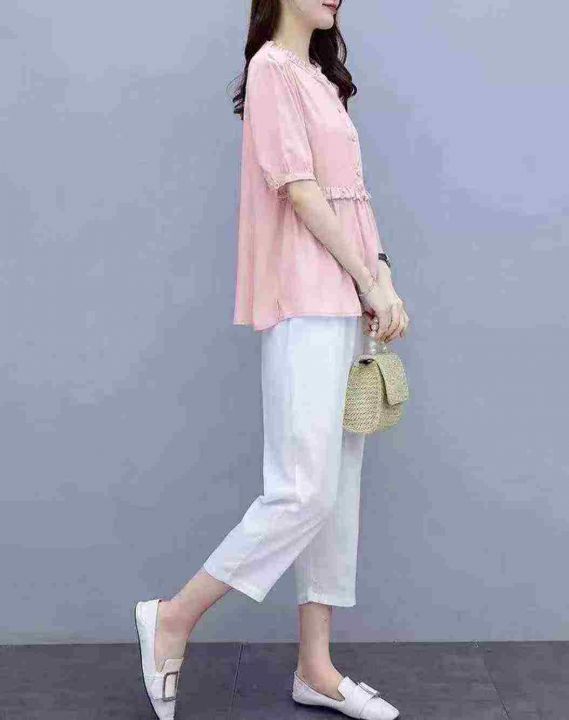 时尚减龄套装338套3.9,荷叶边拼接,纽扣设计,裤子松...