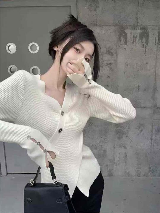 不规则v领针织衫女秋冬设计感小众毛衣开叉修身上衣潮...