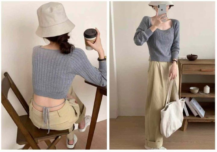 春秋新款法式方领前长后短腰间系带设计感后背露腰短款长袖针织羊毛衫,独立包装,均码面料软糯舒适弹力大,348件,全清5.9元超低价秒杀!分货加一!