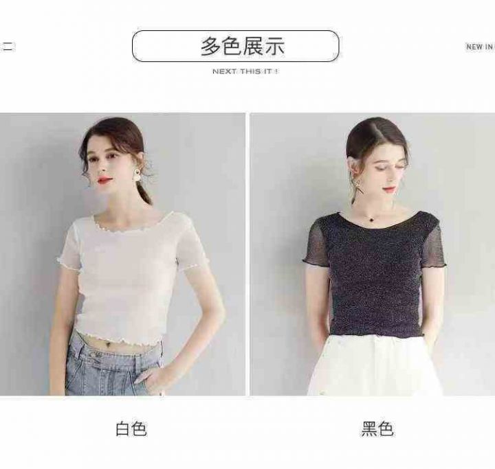 285件短款木耳边网纱打底衫女短袖内搭纱衣圆领新款亮丝半截蕾丝上衣,双层...